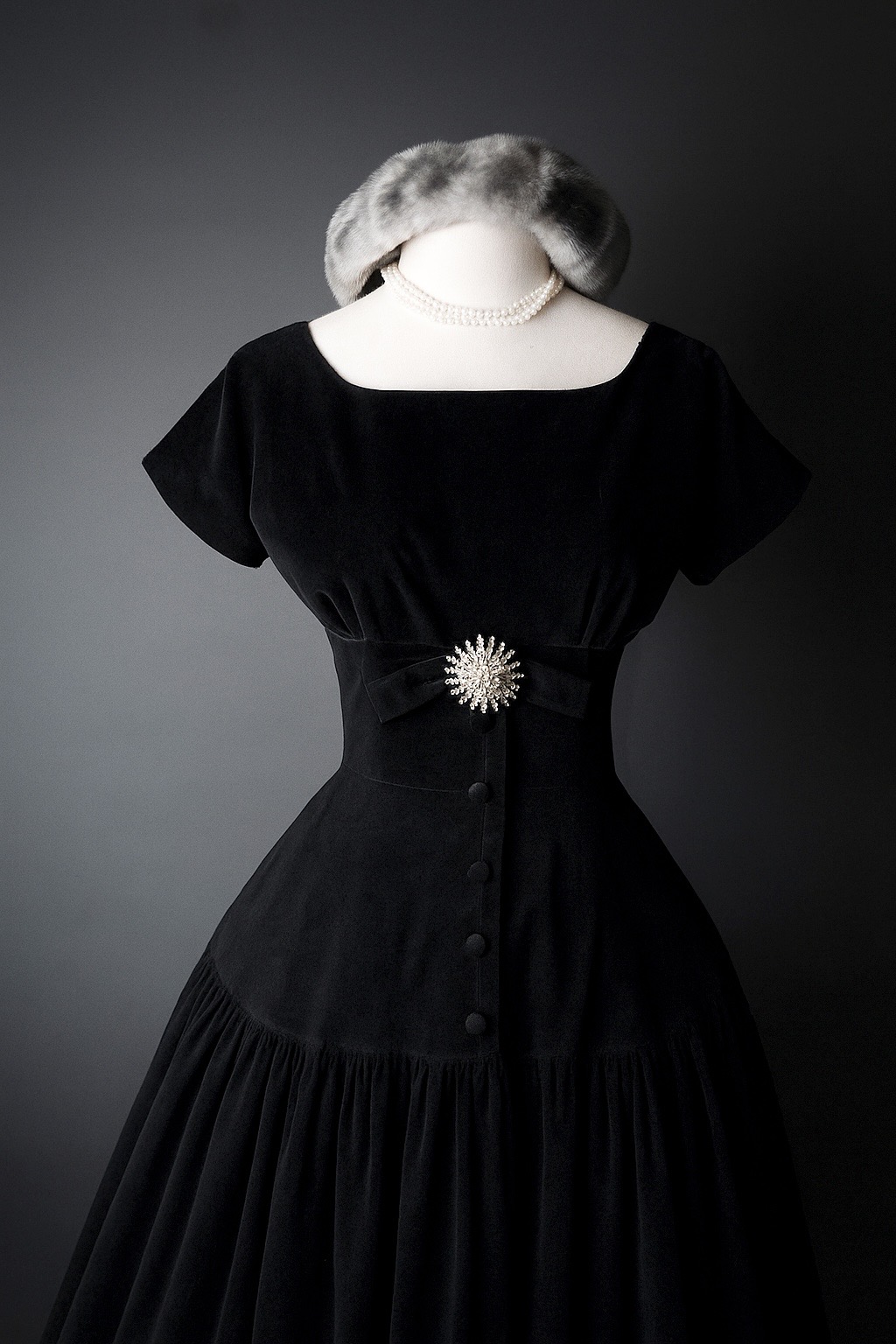 As a PRETTIE LANES original, you can find signature Mid-Century authentic details, such as a lapped metal zipper (center back), true to era seam finishing and genuinely hand-stitched details inside the dress - a couture finish typical for the fashion of the 1950s.