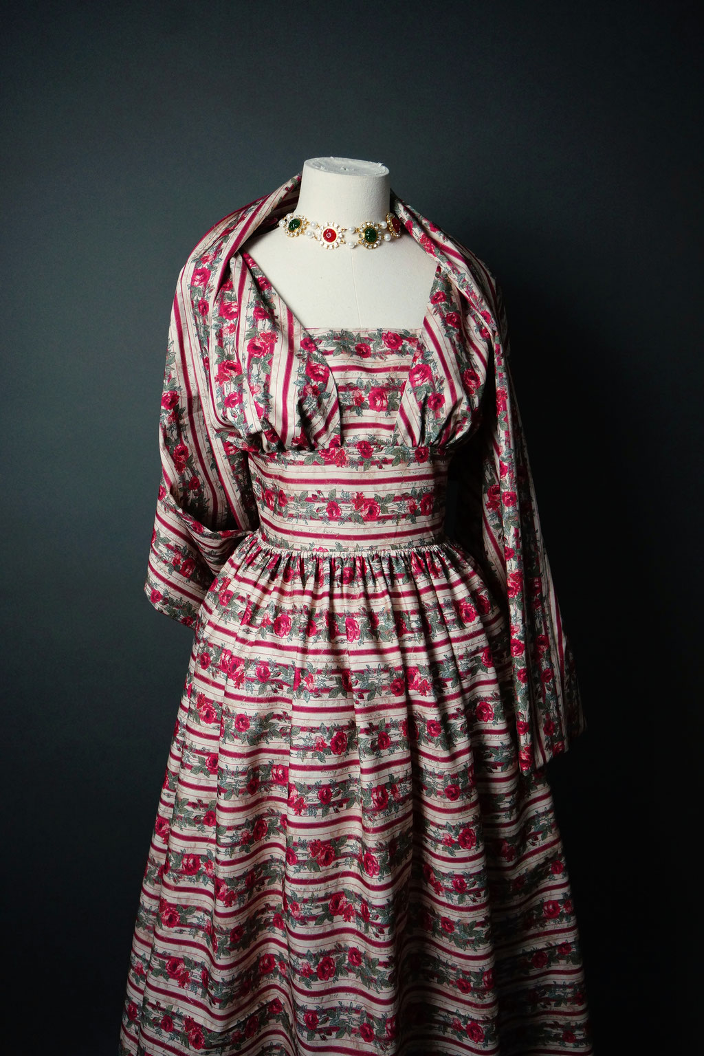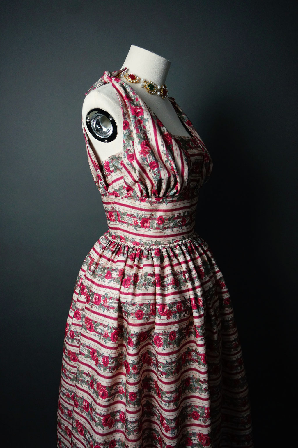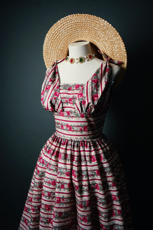 As a PRETTIE LANES original, you can find signature Mid-Century authentic details, such as a lapped metal zipper (center back), true to era seam finishing and genuinely hand-stitched details inside the dress - a couture finish typical for the fashion of the 1950s.